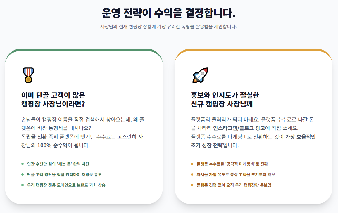 - 이미 단골이 많은 유명 캠핑장: 검색해서 들어오는 손님들에게 왜 수수료를 내고 예약을 받으시나요? 독립몰로 전환하는 즉시 연간 수천만 원의 순수익이 늘어납니다.