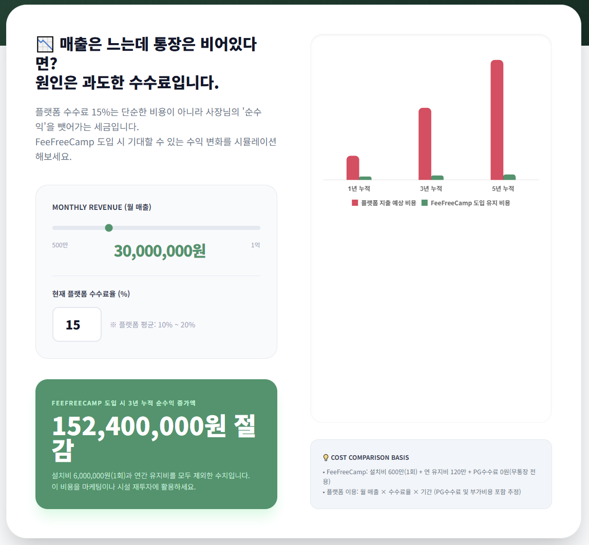 오늘은 그 수수료를 0원으로 만들고, 사장님의 순수익을 100% 지켜드리는 혁신적인 솔루션, 피프리캠프솔루션을 소개해 드립니다.